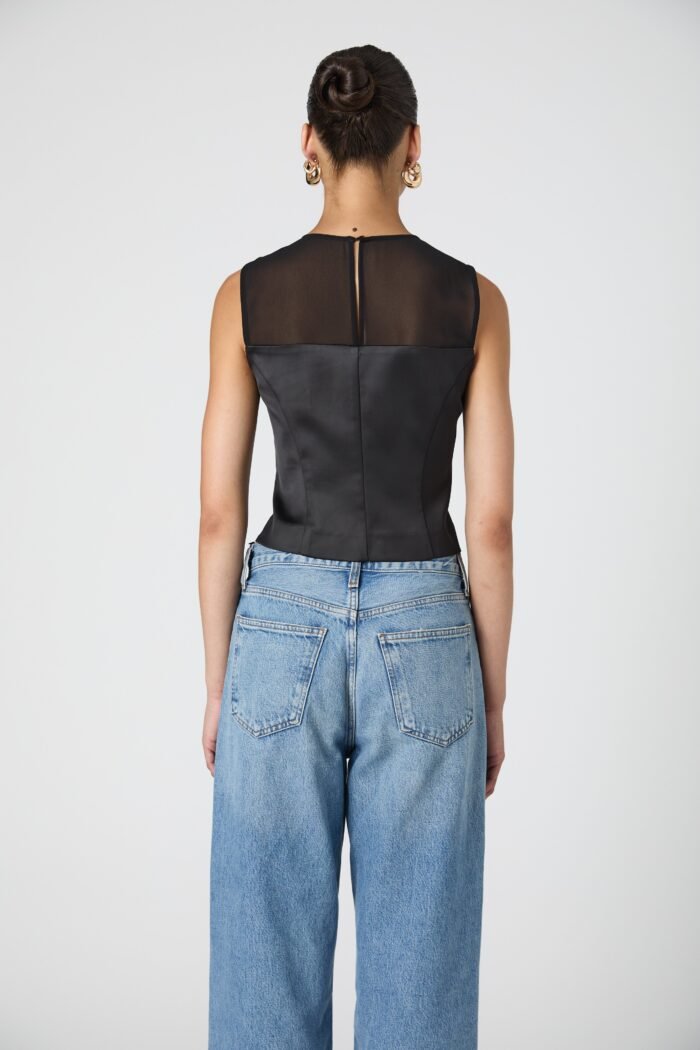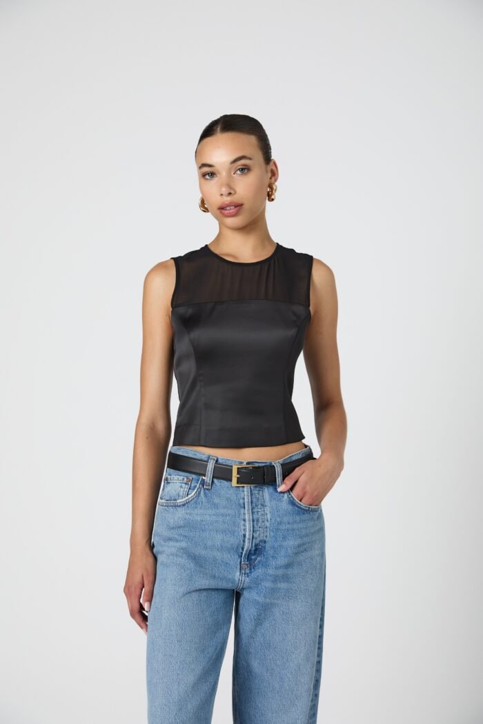 Experience the ultimate in sophistication and style with our Sheer Panel Satin Sleeveless Top. The delicate chiffon panel adds a touch of elegance. while the structured satin offers a polished look. Elevate your wardrobe and make a statement in this perfect desk-to-dinner top.